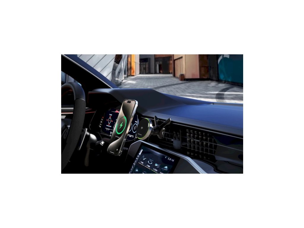 Tento držák do auta je navržen pro snadné uchycení a stabilitu díky silným magnetům. Podporuje bezdrátové nabíjení až 15 W a je kompatibilní s různými zařízeními. Umožňuje vertikální i horizontální orientaci telefonu, což usnadňuje navigaci a ovládání. Díky elegantnímu designu se skvěle hodí do každého interiéru vozidla a zajišťuje bezpečné a efektivní nabíjení i během delších jízd.