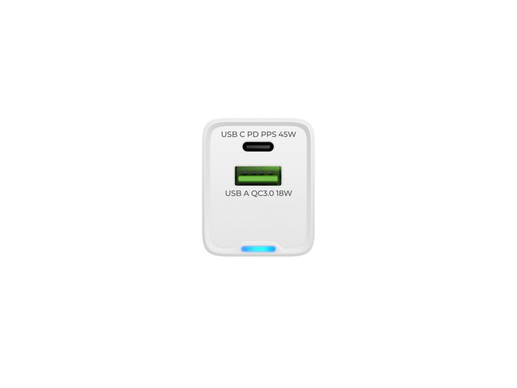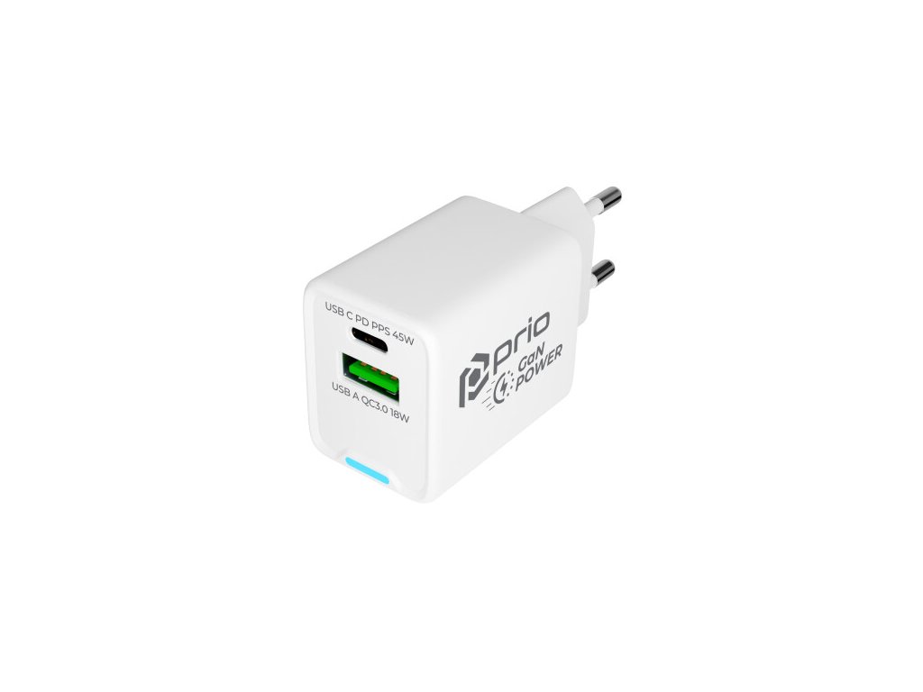 Napájecí adaptér Prio GaN 45W, PD USB-C + QC 3.0 USB-A (Bílá)
