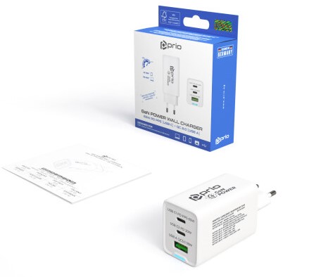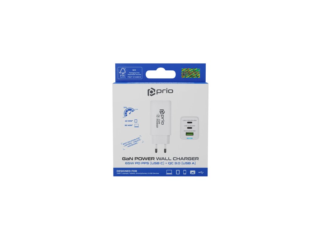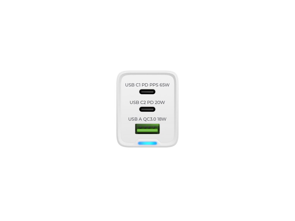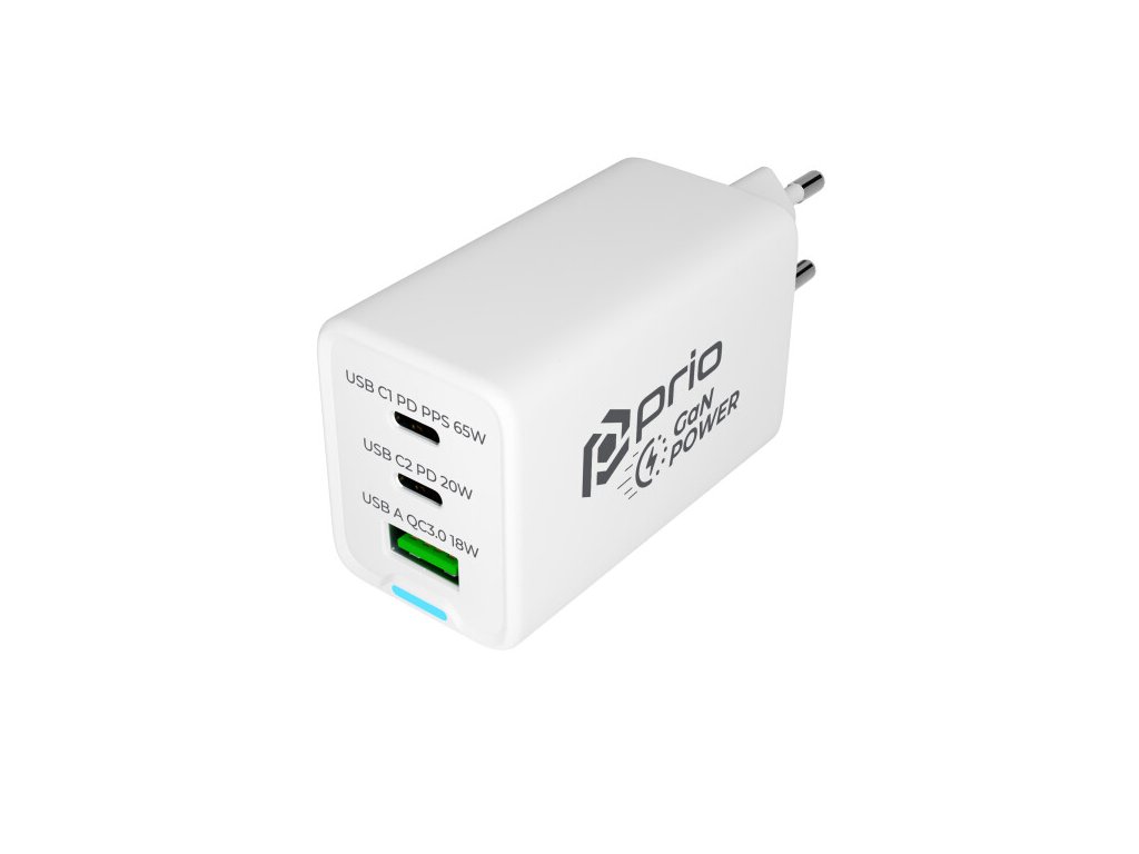 Napájecí adaptér Prio GaN 65W, 2x PD USB-C + QC 3.0 USB-A (Bílá)