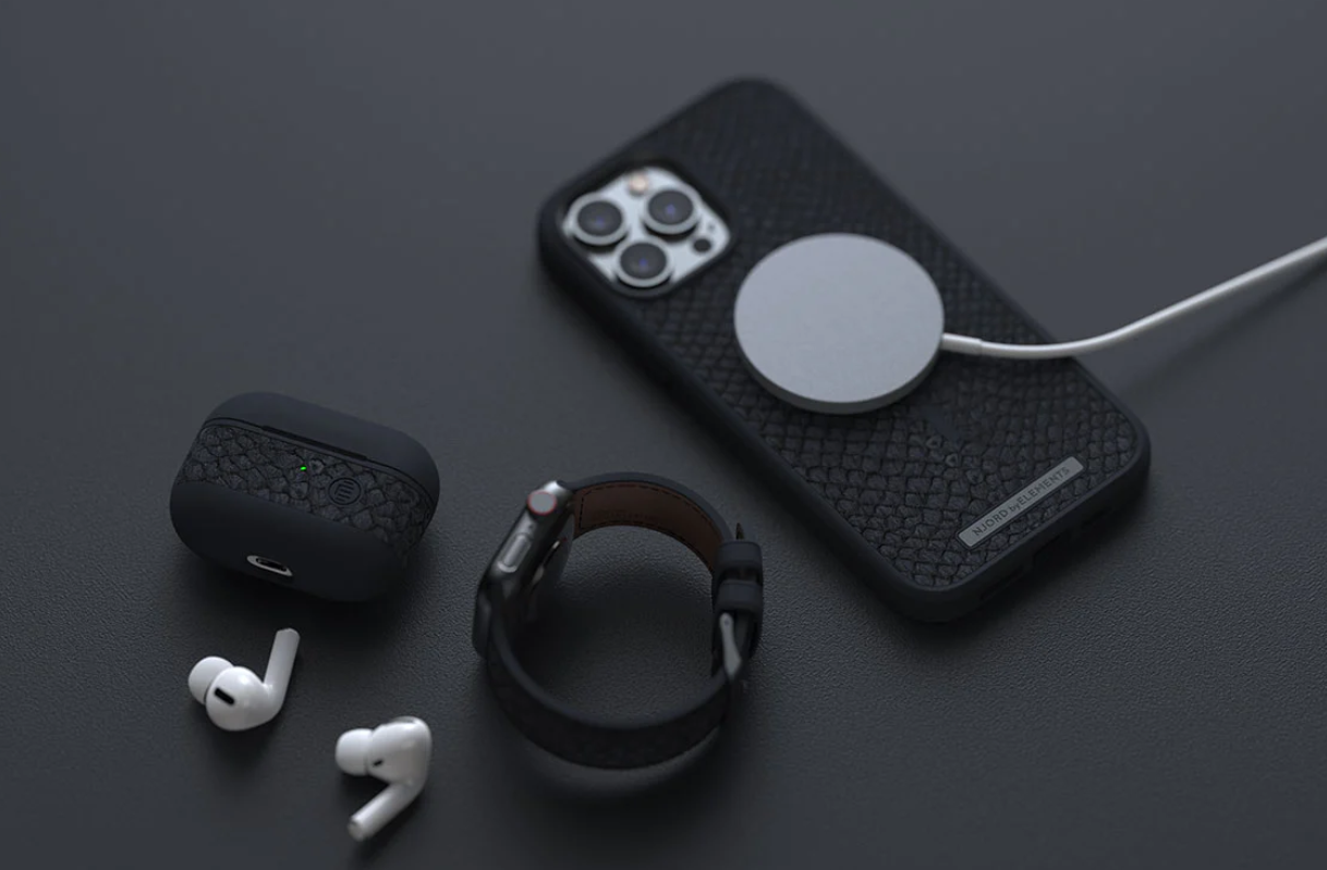 Luxusní pouzdro pro AirPods výrobce Njord by ELEMENTS představují dokonalý vzhled a výborný módní doplněk. Jsou vyrobeny šetrně k životnímu prostředí, jelikož kůže použitá pro výrobu pochází z odvětví chovu ryb kdy jde o vedlejší produkt, jež by jinak neměl využití. Navíc se při výrobním procesu využívají zdroje vodní a geotermální energie. To vše ve výrobním závodě v Sauðárkrókur na Islandu