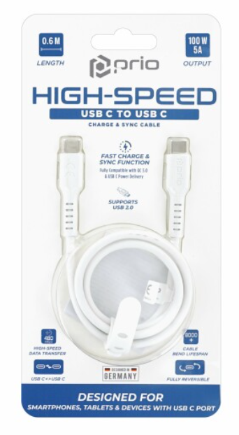 Prio prémiový vysokorychlostní kabel USB Type-C na USB Type-C pro nabíjení, přenos dat a synchronizaci