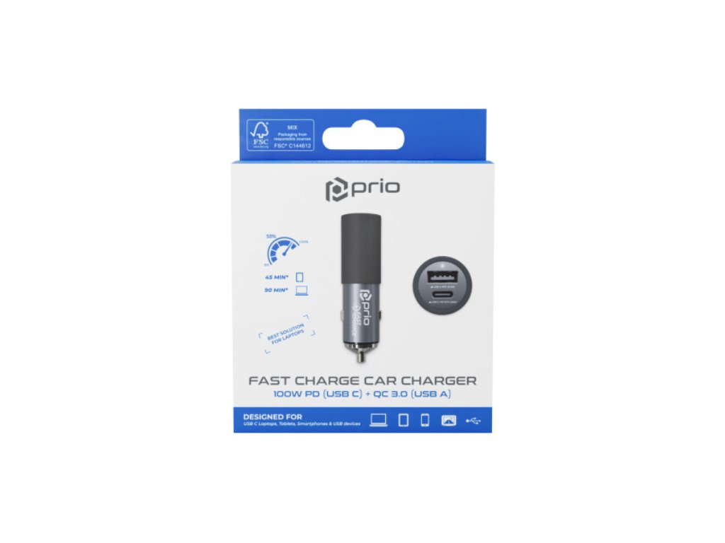 Prio Fast Charge Car Charger nabízí až 100W výkonu, což zaručuje bleskové nabíjení vašich zařízení během jízdy. Podporuje jak USB-C Power Delivery (PD), tak i USB-A pro maximální kompatibilitu.