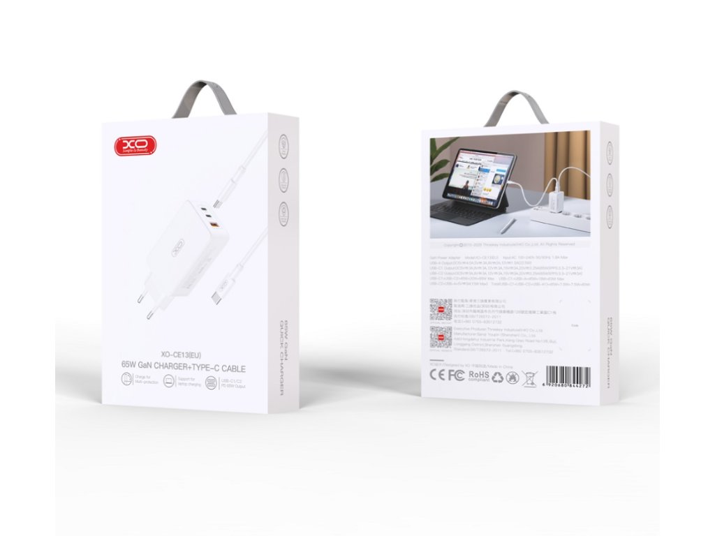 XO CE13 je vysoce výkonná nabíječka s celkovým výkonem až 65 W a třemi porty pro nabíjení více zařízení současně. Podporuje pokročilé nabíjecí technologie Power Delivery (PD) a Quick Charge 3.0 (QC 3.0), což zajišťuje rychlé a efektivní nabíjení. Součástí balení je USB-C na USB-C kabel, který je ideální pro nabíjení moderních zařízení, jako jsou notebooky, tablety nebo telefony. Její kompaktní design v bílé barvě se snadno vejde do tašky, což ji činí ideální na cesty. Díky integrovaným bezpečnostním prvkům chrání připojená zařízení před přepětím, přehřátím a zkratem.